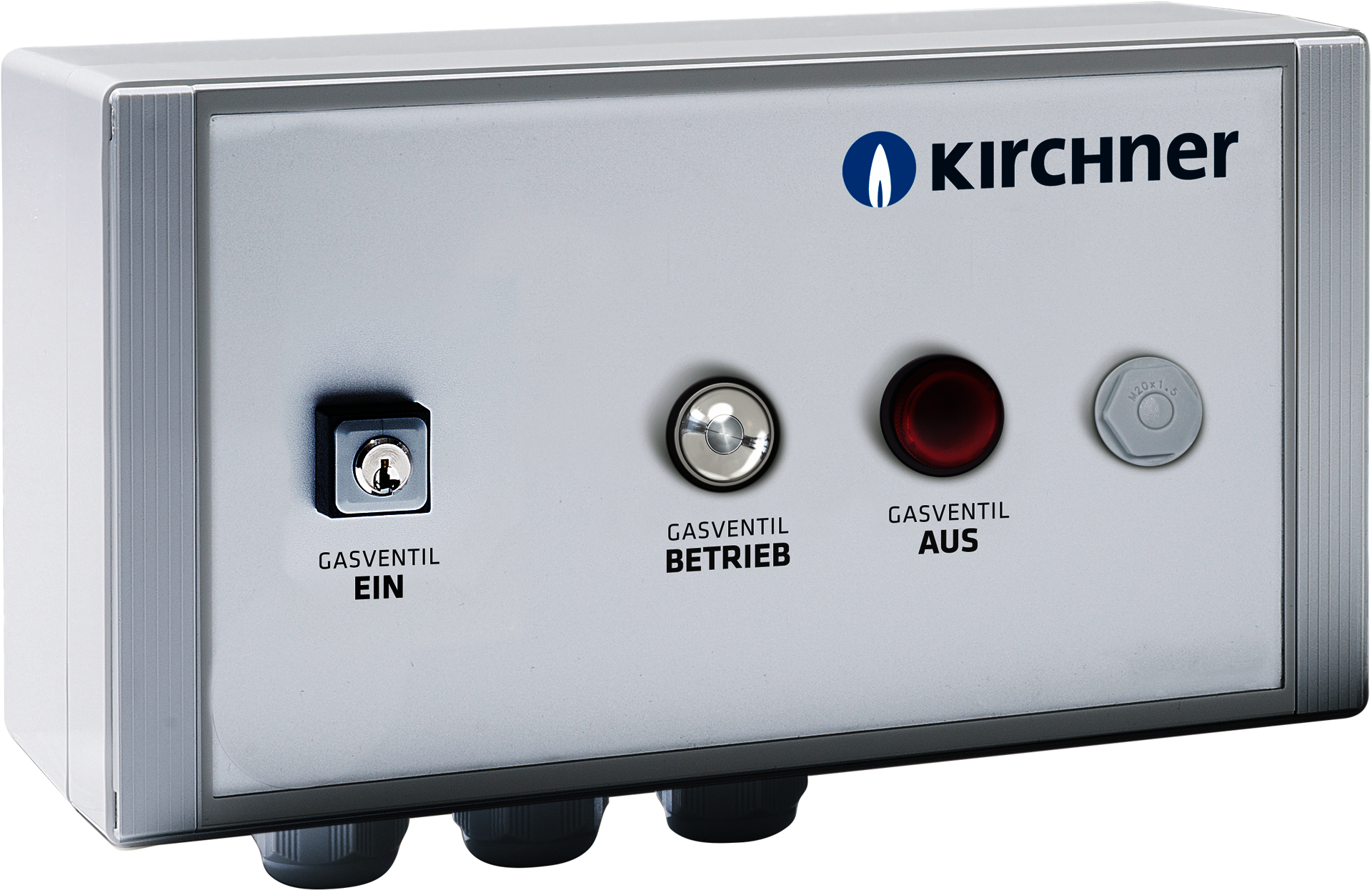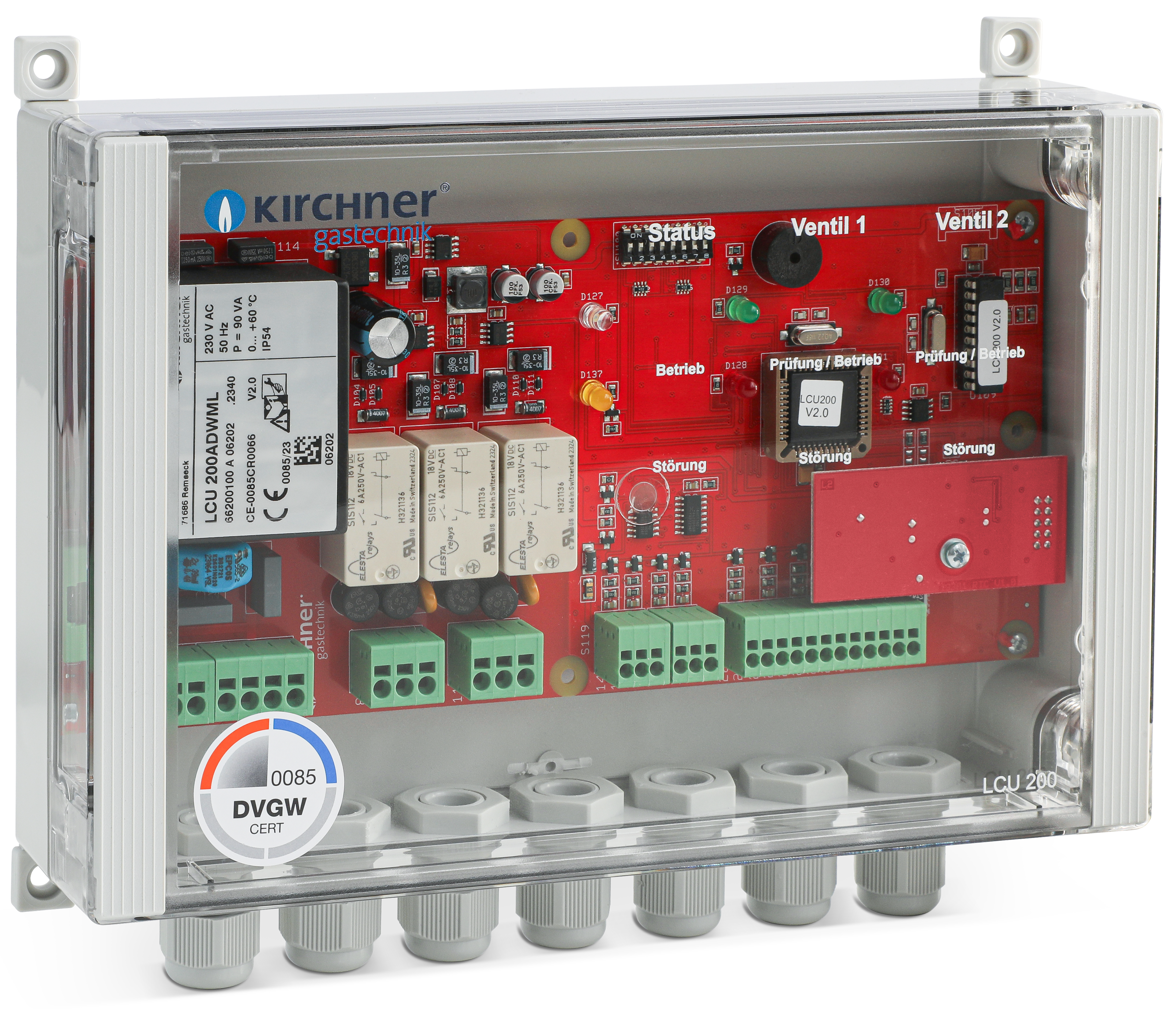 Fernbedienung zur externen Ansteuerung einer Labor-Steuerung LCU 200ADWM, mit Schlüsselschalter im Smart-Box Gehäuse. Bedienung über Folientaster für Ventil 1 und Ventil 2, Anzeige über Status LED's grün / rot (pro Ventil: Prüfung läuft, Prüfung i. O. / Ventil offen, Prüfung n. i. O, Gasmangel), mit Resettaster. Anschluß an die LCU 200 erfolgt über die Klemmen 20 –31 mit bauseitigem 12 adrigem Kabel Typ LiHH 12x0,25 mm2.